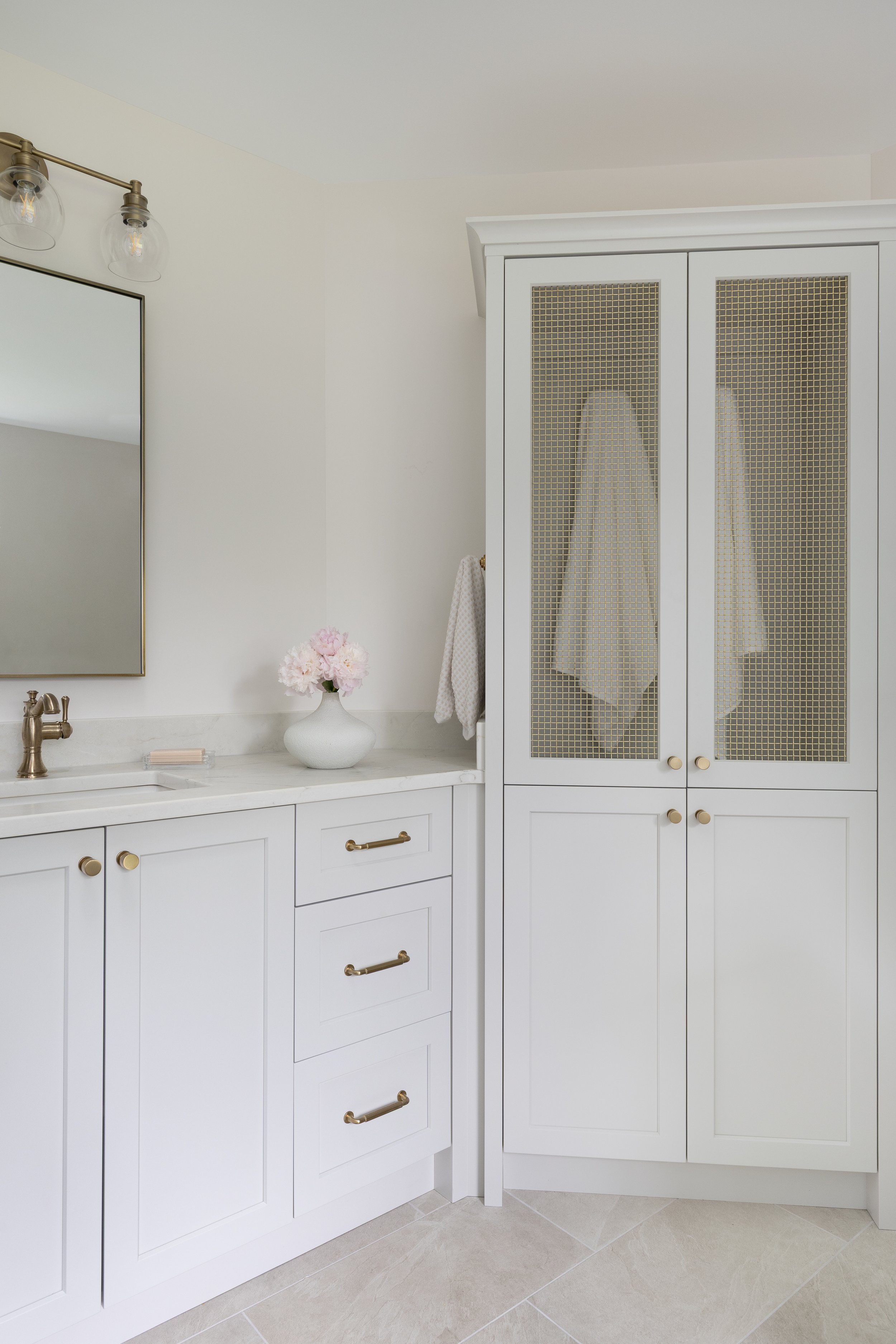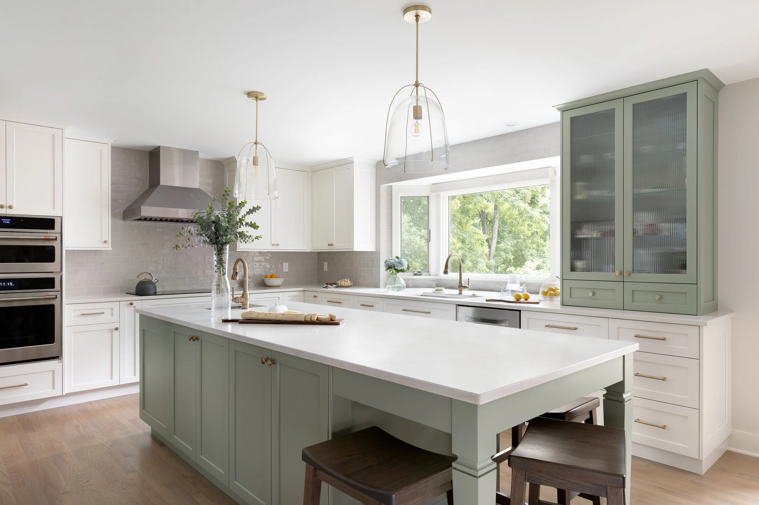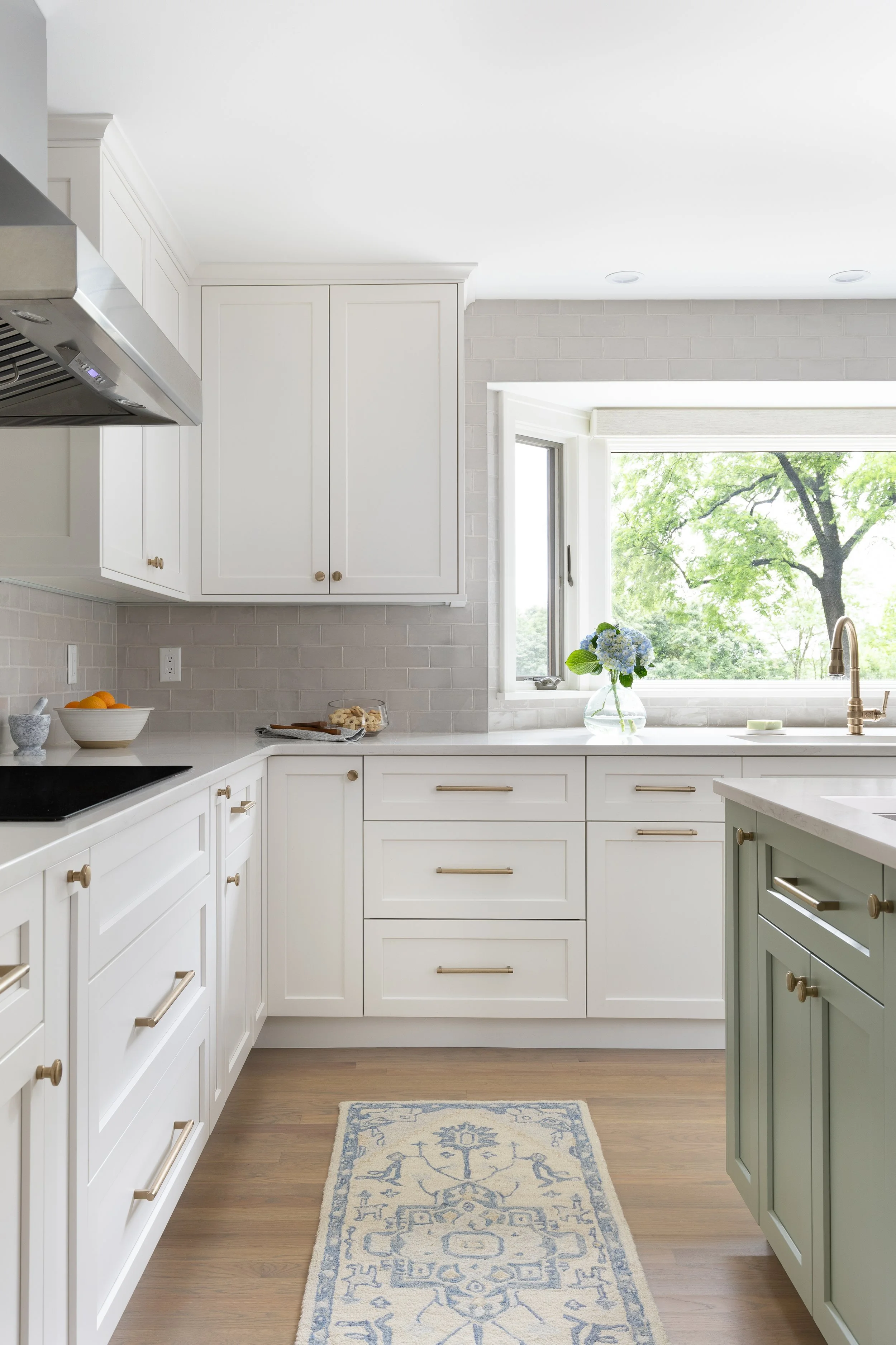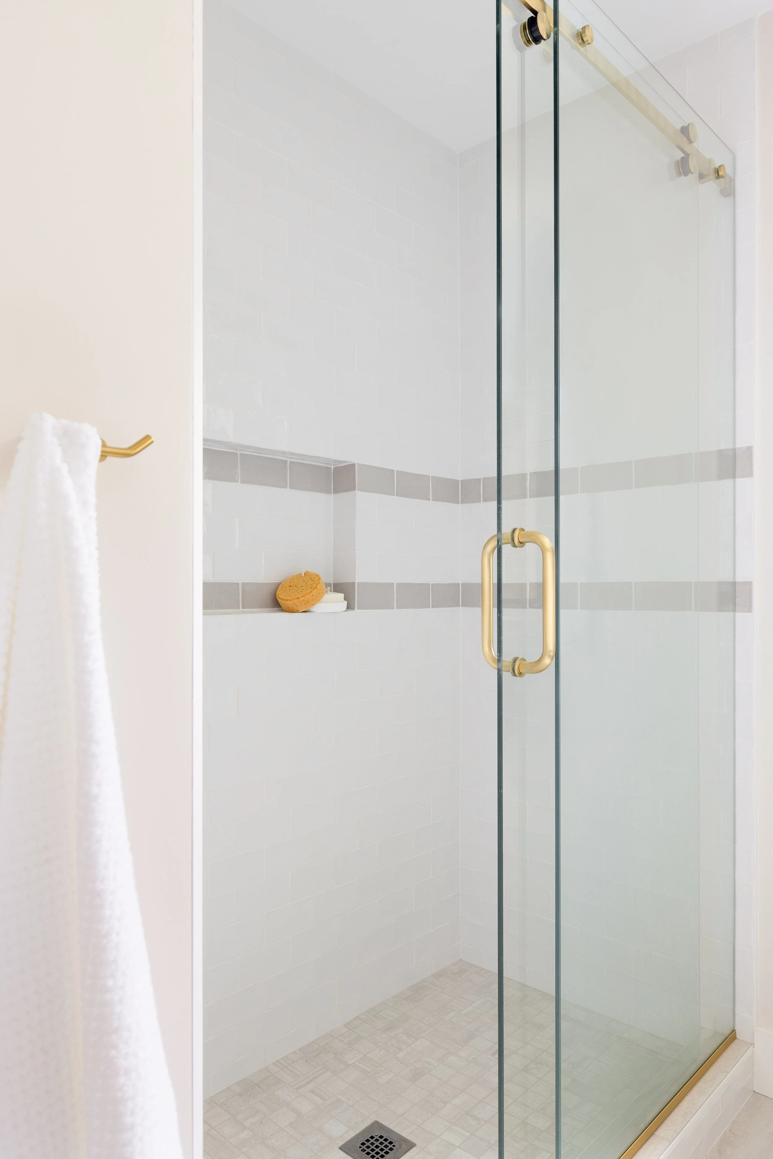 This whole-home remodel included the primary bath, guest bath, powder room, kitchen, living room, and mudroom. Our design focuses on light, bright finishes with a traditional lean—warm brass fixtures, a soft tile palette, and timeless painted cabinetry. The result is a cohesive, welcoming home that feels classic, airy, and built to last.